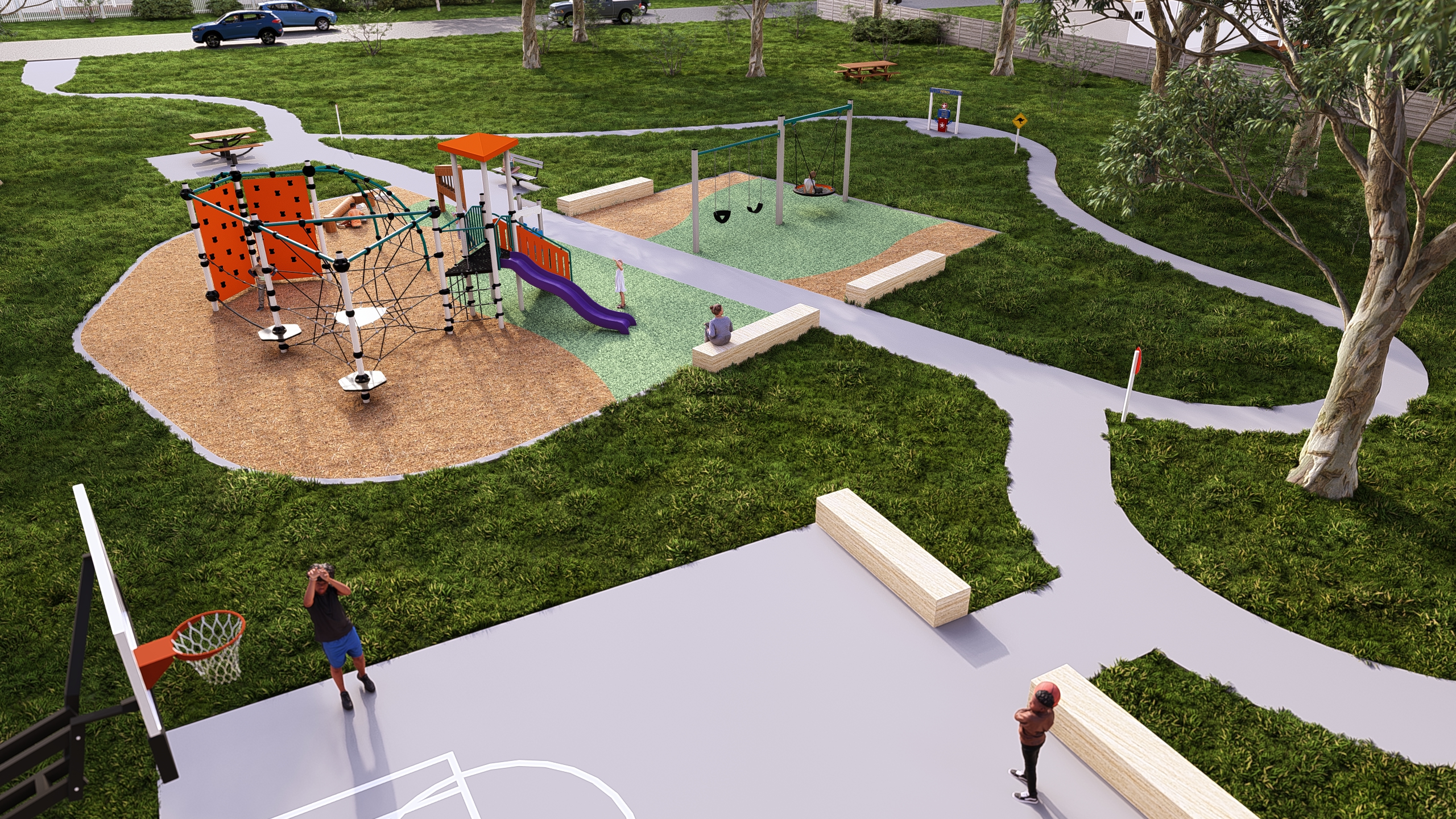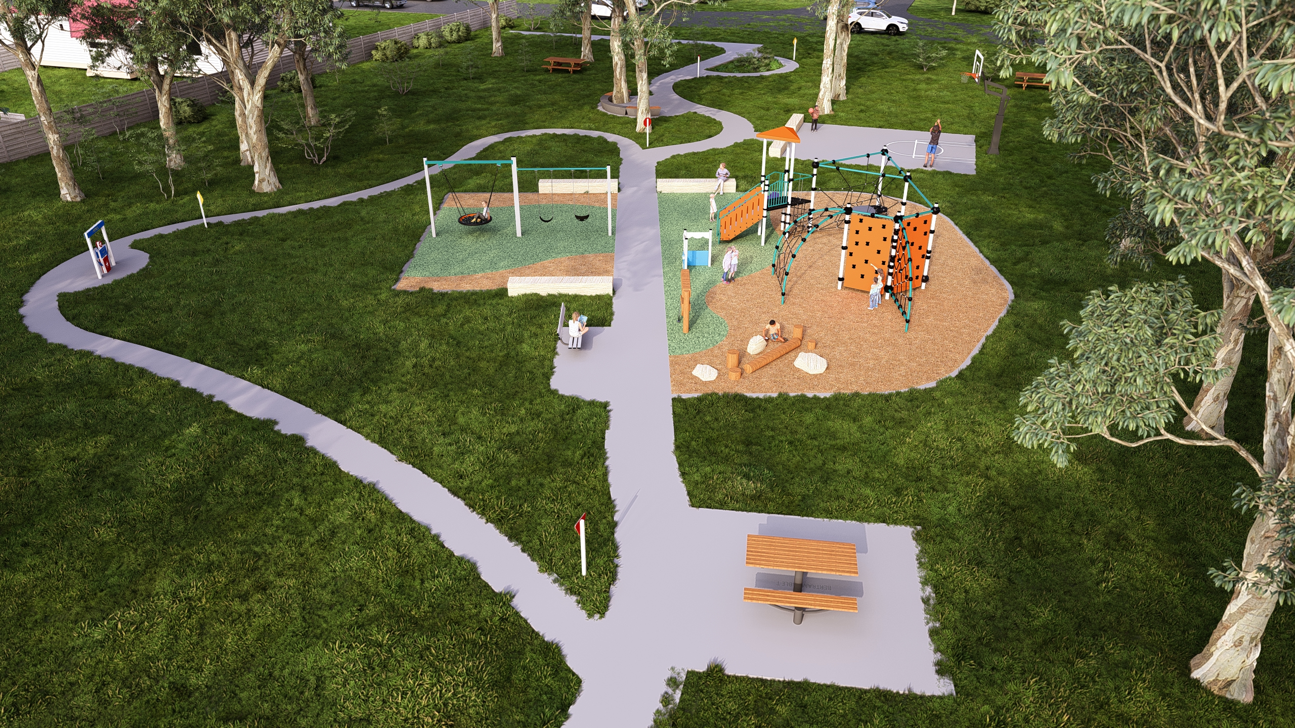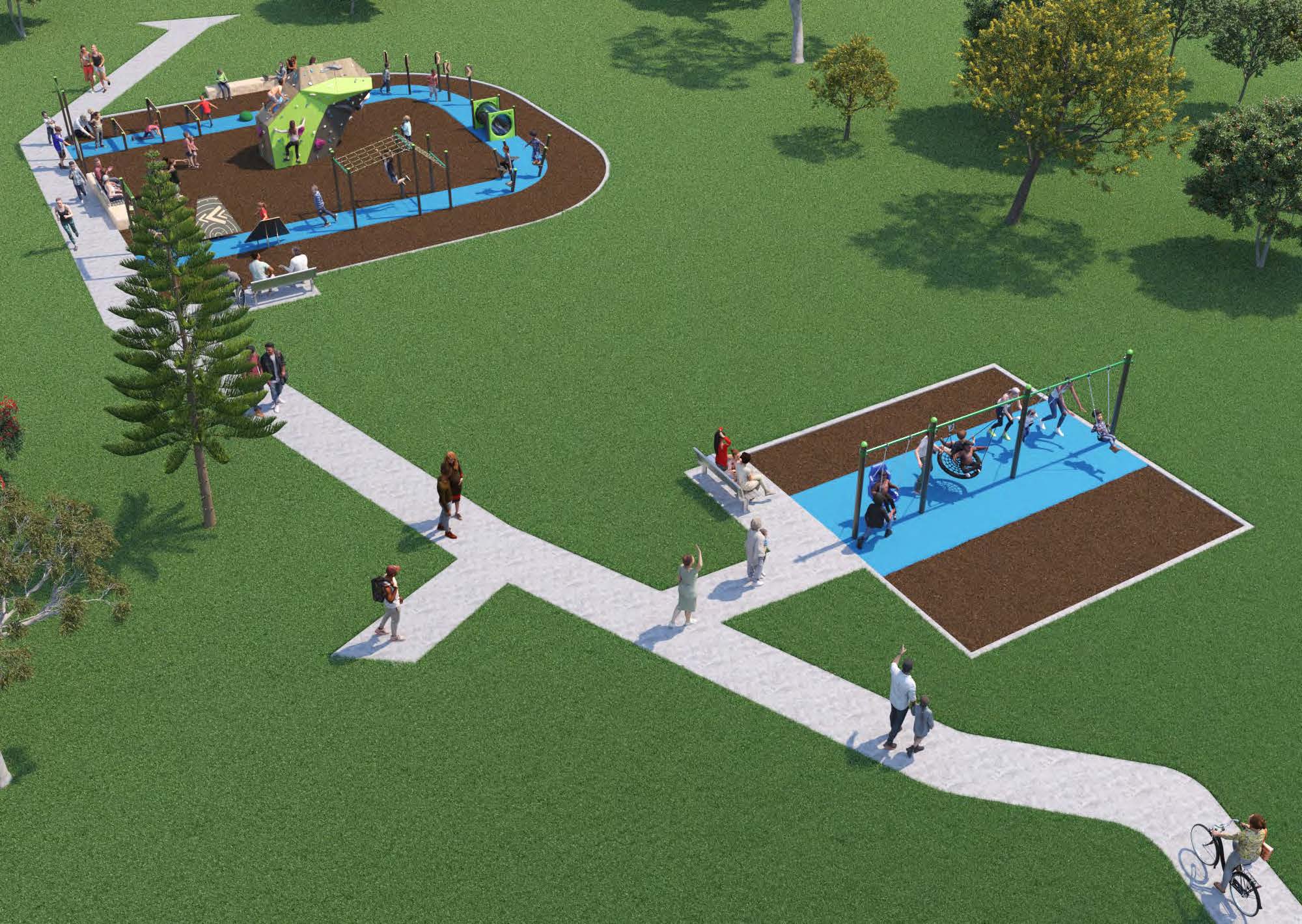 As part of the Neighbourhood Parks Program, the ageing play equipment will be renewed. Early ideas also include installing a new multi-use games area (MUGA) court near the tennis courts, adding informal sandstone seating between the two courts, formalising the existing ball wall near the clubhouse, and extending the footpath to improve access between play spaces.