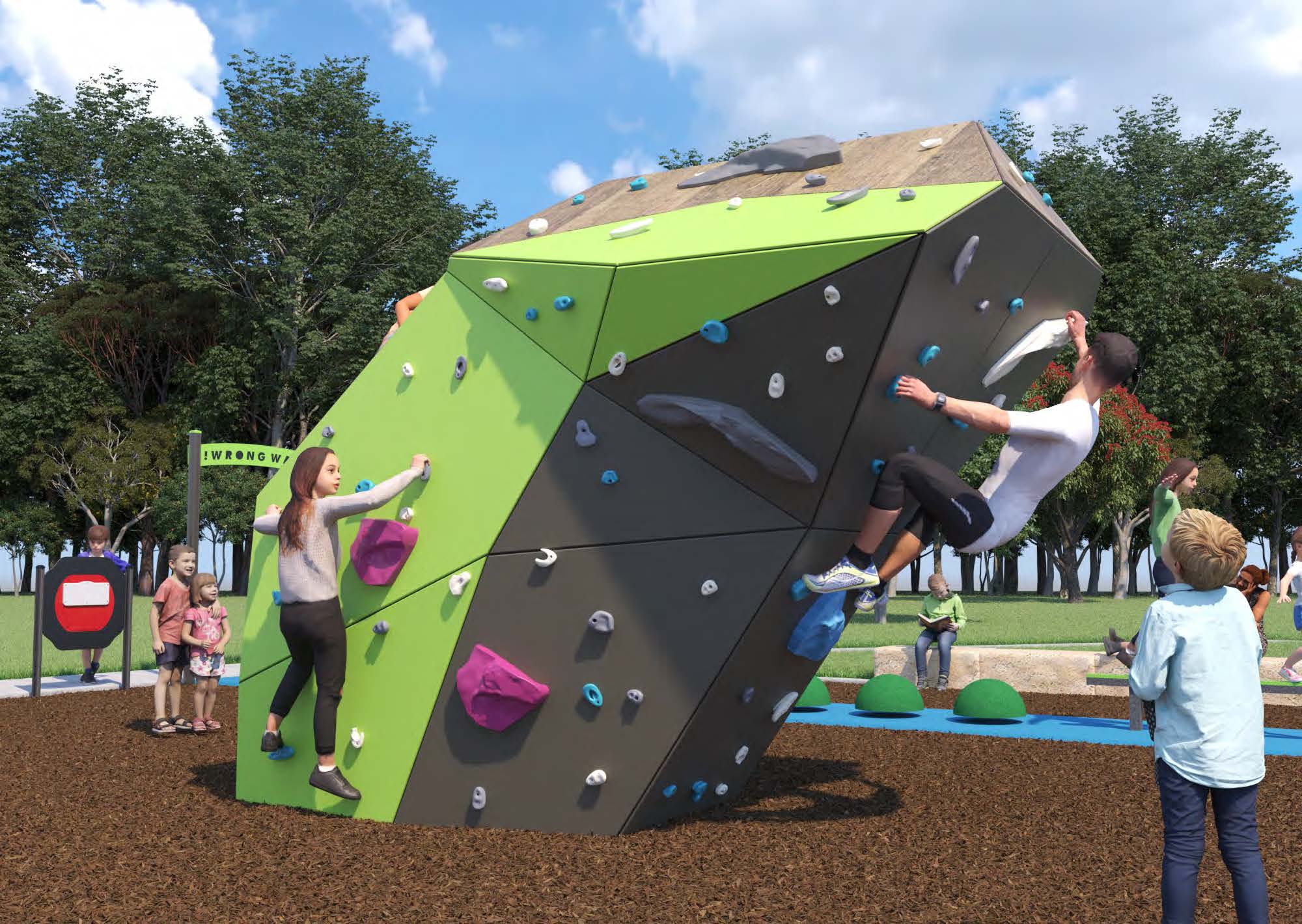 Option 1 for Melrose Park has a really strong focus on nature play. This option features natural stone rock climbing it also has log and rock balancing element.