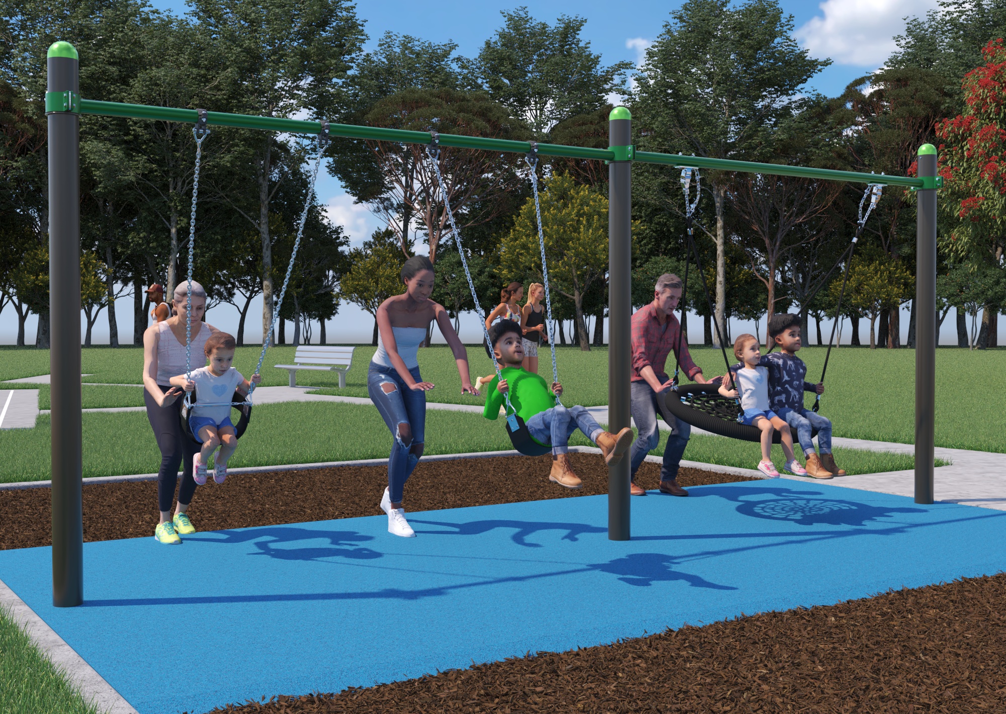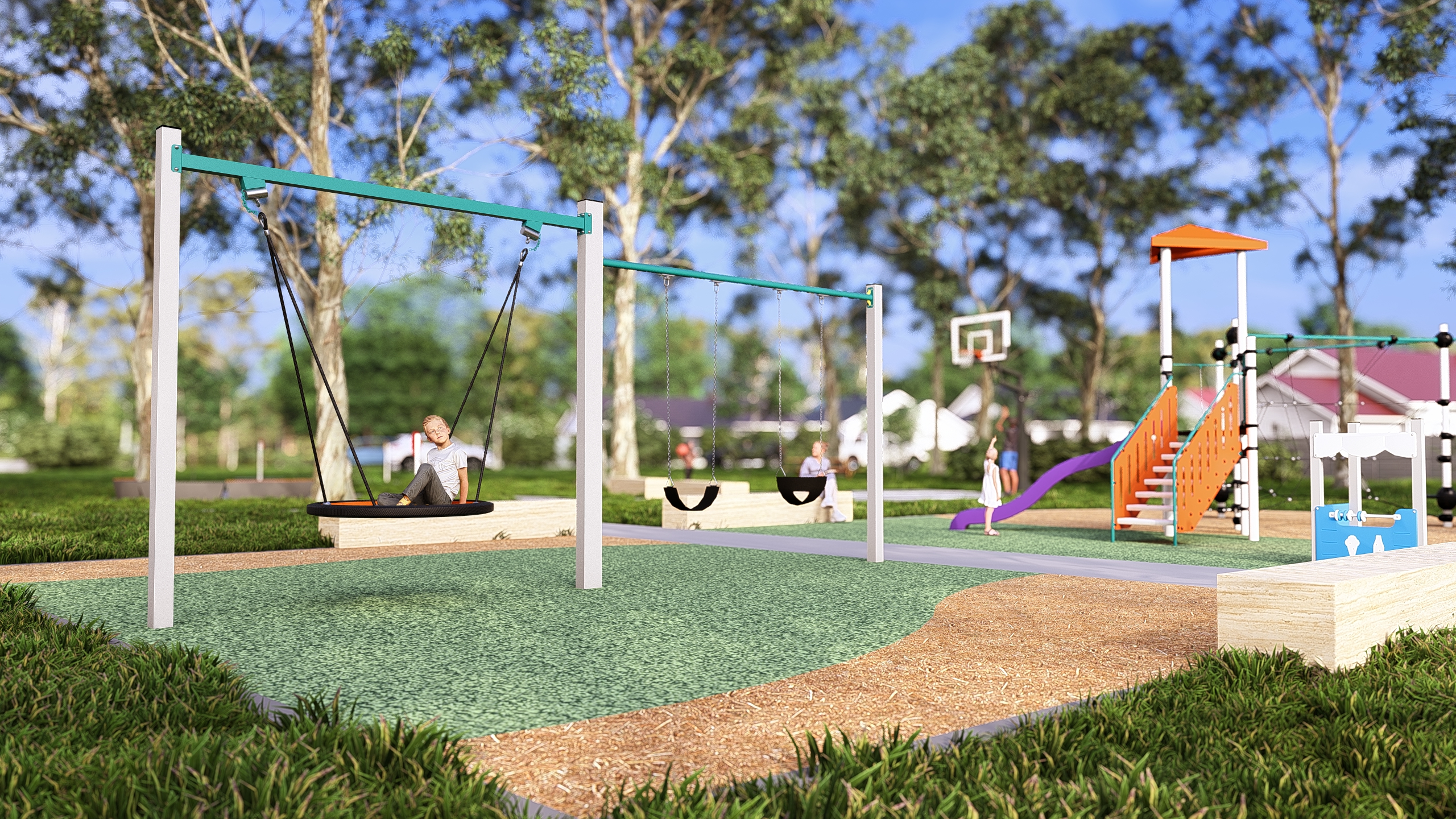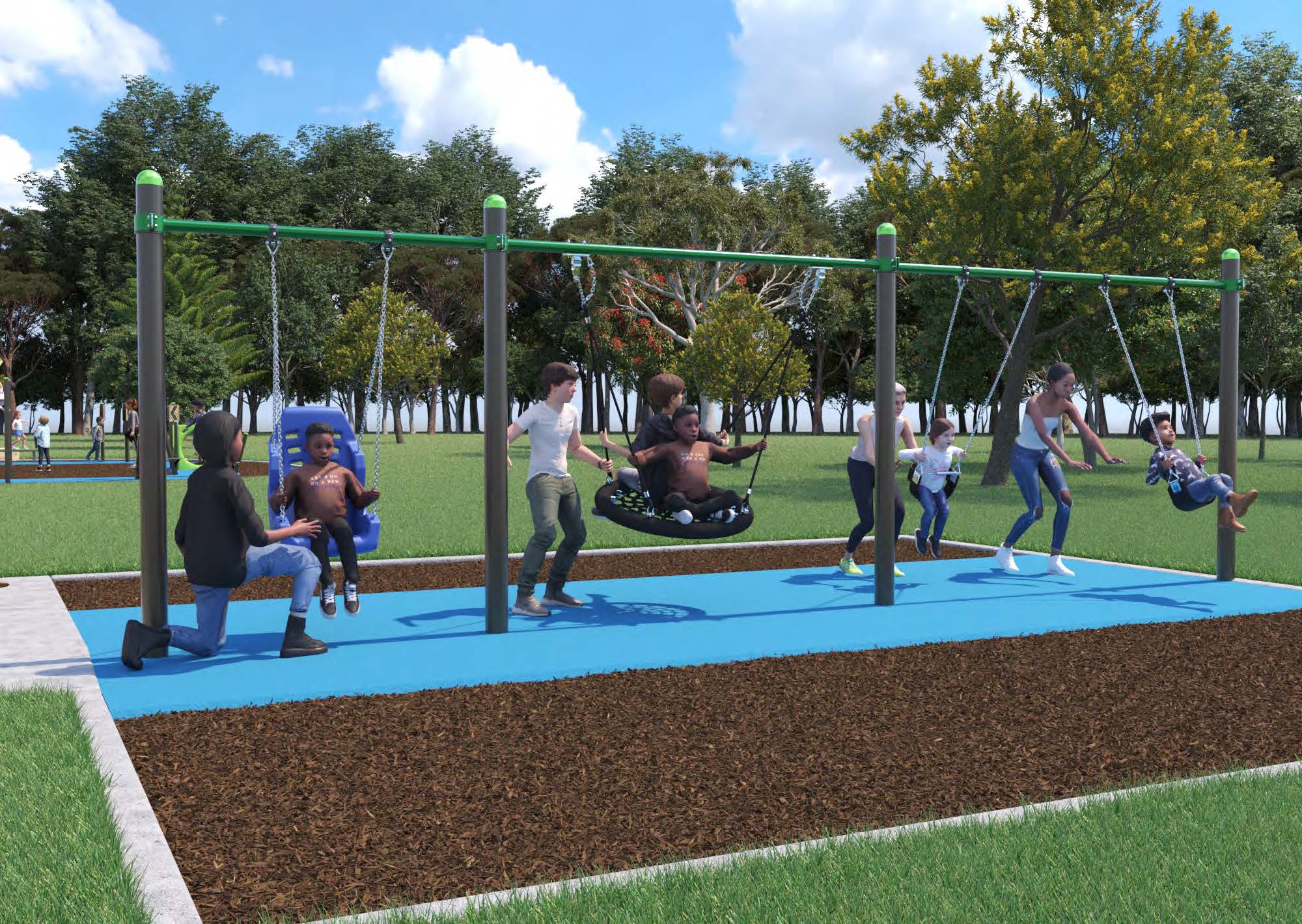 Both options have new swings. There are four swings including a standard seat swing, a basket swing, a toddler swing and a full support swing which can be used by people who require back support. There is rubberised softfall allowing all swings to be accessed with ease. There is also plenty of seating.