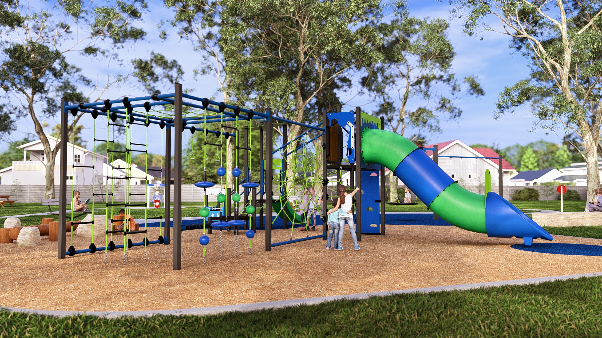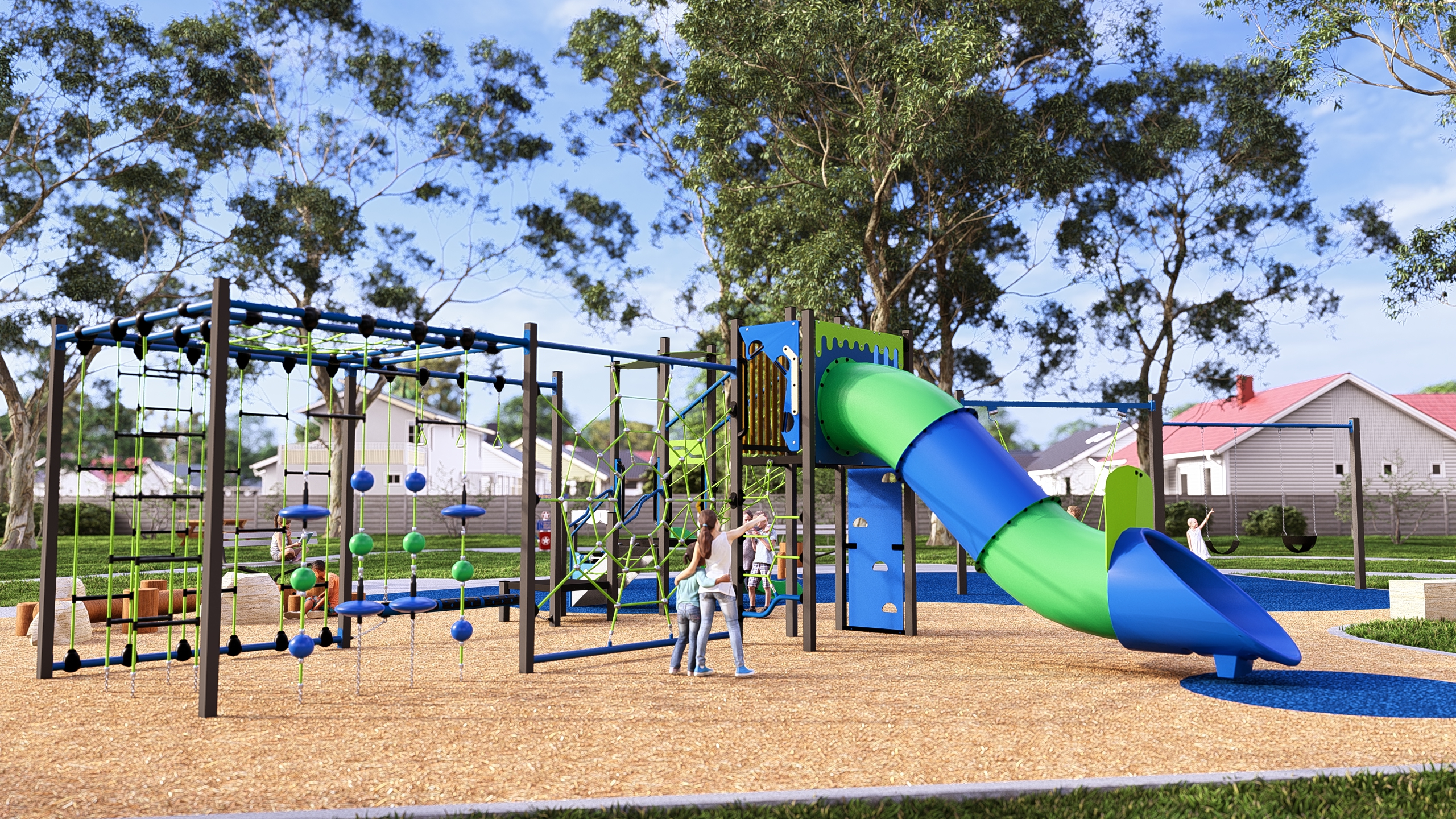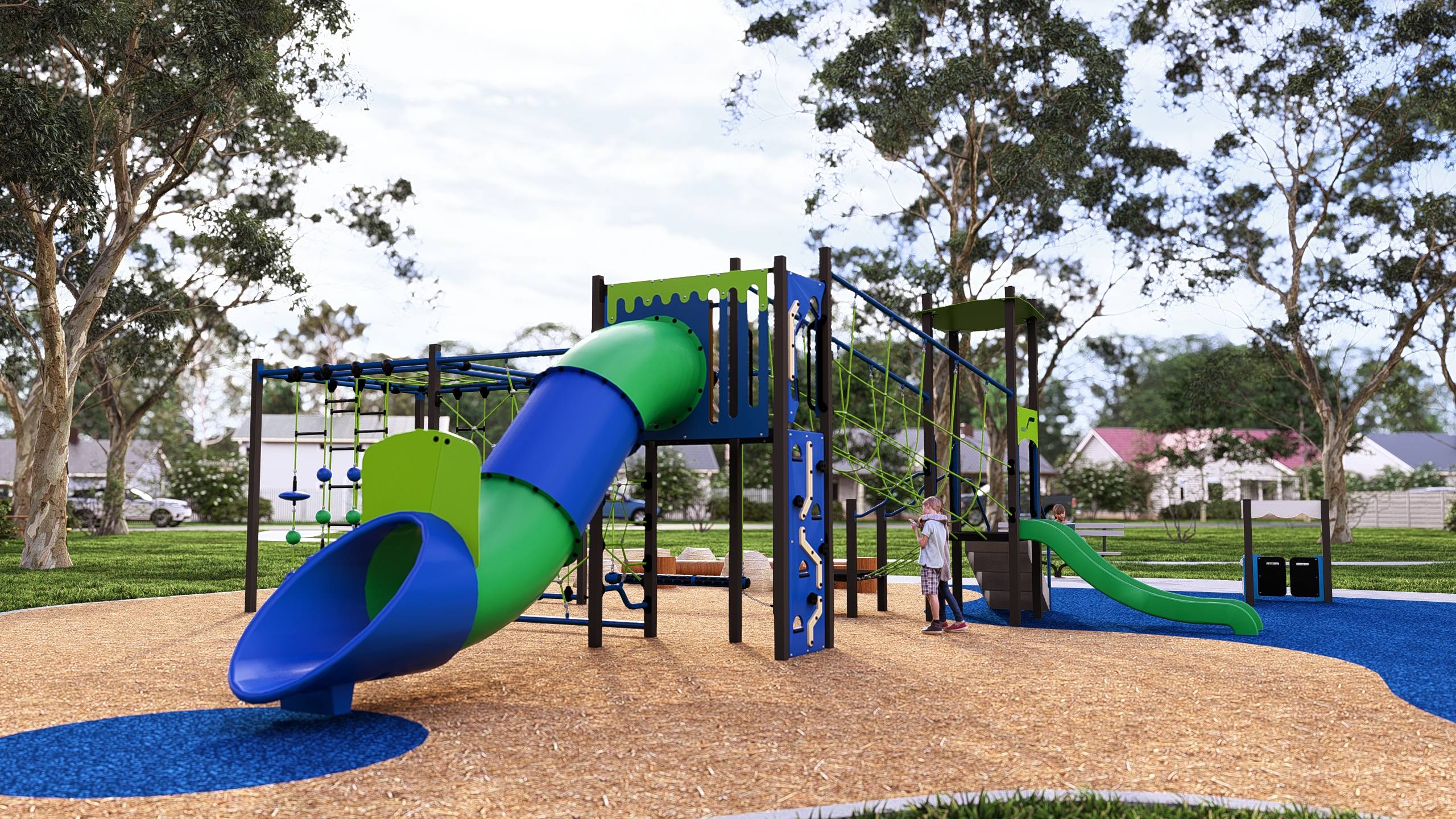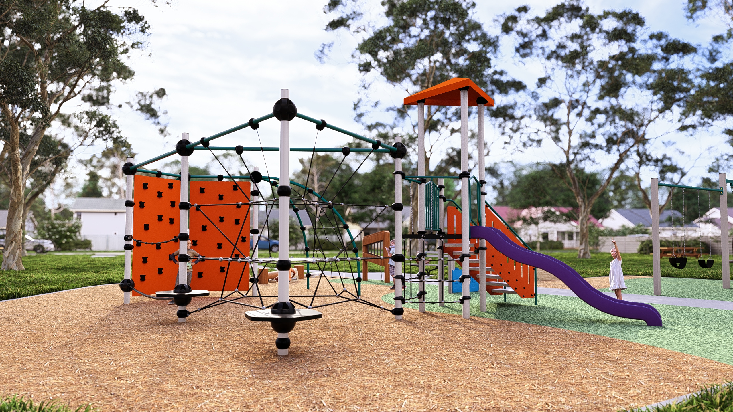 The central climbing element has a tall slide and twin slides which will get kids playing together learning cooperation and collaboration. The interactive imagination element is a specially designed Melrose General Store and a highly entertaining distortion mirror.