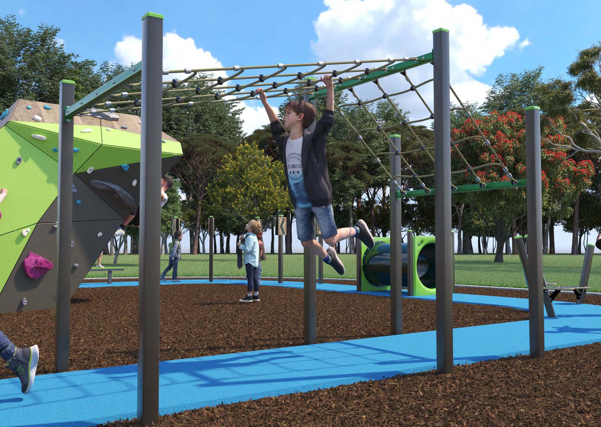 Option 1 includes a challenging climbing structure with lots of options for thrill seekers. And a nature play balance trail using natural materials timber and rock compliments the natural features of the park. Kinetic play options include a new set of swings which includes a basket swing which can be shared or used by people with a disability who can be lifted onto the swing and a rocker for young children.